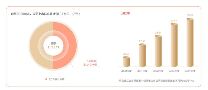此外,该行董事会审议通过的利润分拨预案为:向合座等闲股鼓动每10股派发现款股利10.66元(含税),2025年现款分成比例打破30%,五年分成总和达1069亿元。