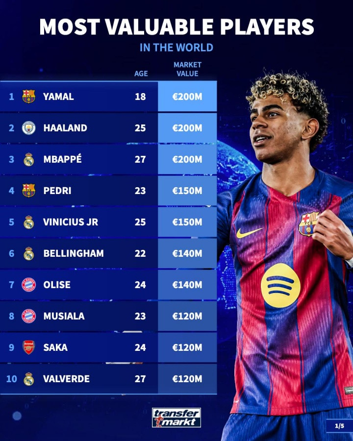 1-亚马尔(巴萨),18岁,2亿欧