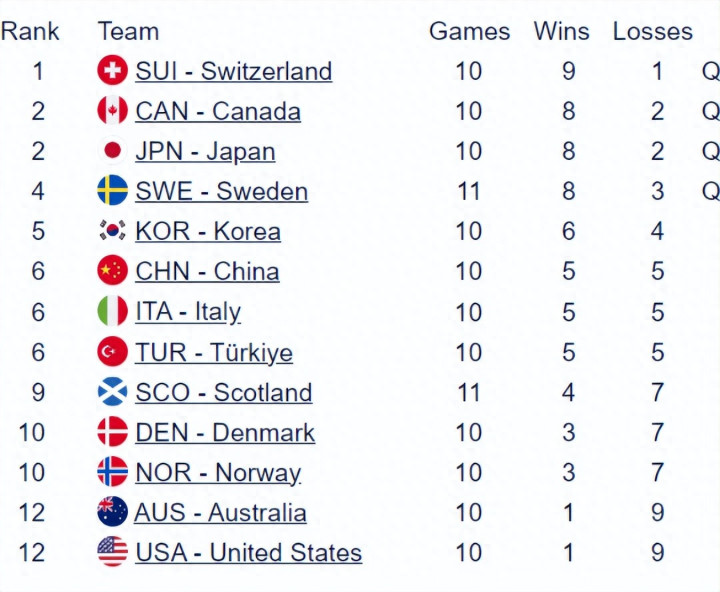 女子冰壶世锦赛松手了第五天的争夺之后,当今积分榜名次前四的瑞士队,加拿大队,日本队以及瑞典队提前晋级下一轮,之后还将进行终末三轮轮回赛,剩余两个附加赛限额仍待角逐。当今韩国位列积分榜第五,中国、意大利与土耳其并排要津的第六位,好意思国队与澳大利亚队王人只是获得一场到手名次垫底。