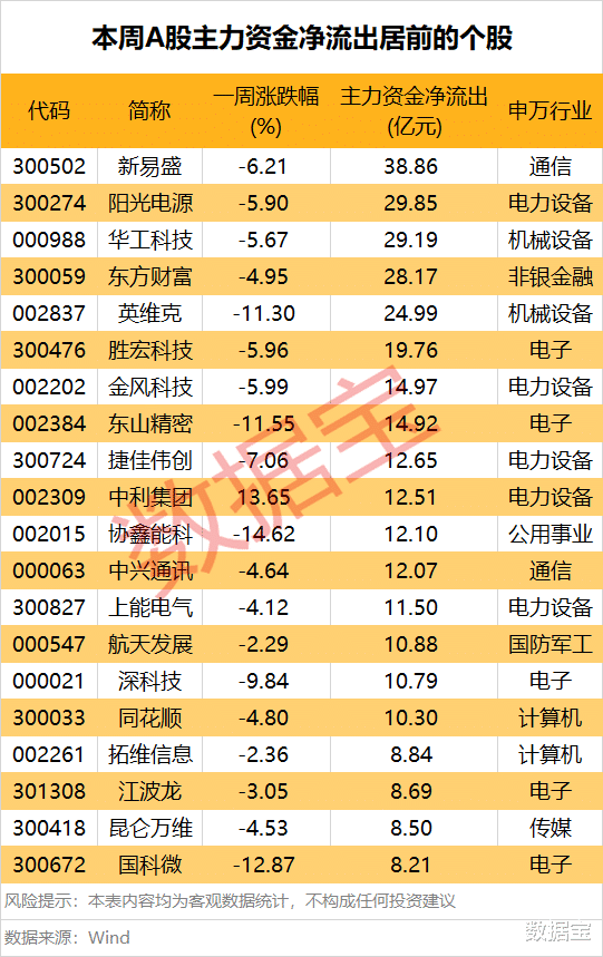 据数据宝统计,本周有64股主力资金净流出额在5亿元以上。新易盛净流出额居首,高达38.86亿元;阳光电源、华工科技、东方资产、英维克紧随后来,净流出额均在20亿元以上。