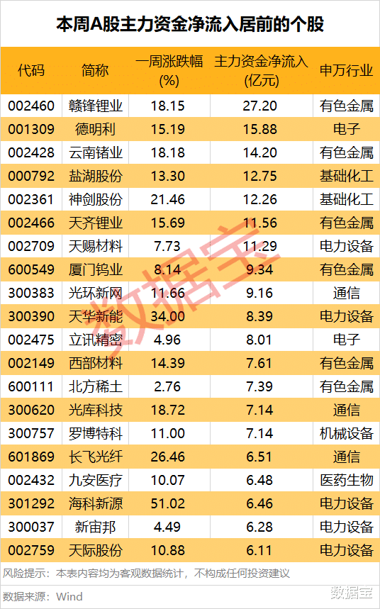 主力资金一周流向出炉,锂电产业链个股受喜爱。