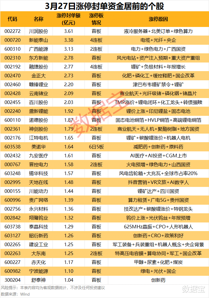 以封单金额打算,川润股份、新能泰山、广西动力涨停板封单资金居前,区分有3.61亿元、3.38亿元、3.13亿元。