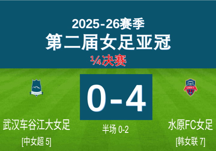第二届女足亚冠在本月伸开了四分之一决赛的四场对决,卫冕冠军武汉女足在主场汉口文学中心,全队情状表欠安,以0-4不敌韩国的水原女足,无缘半决赛。