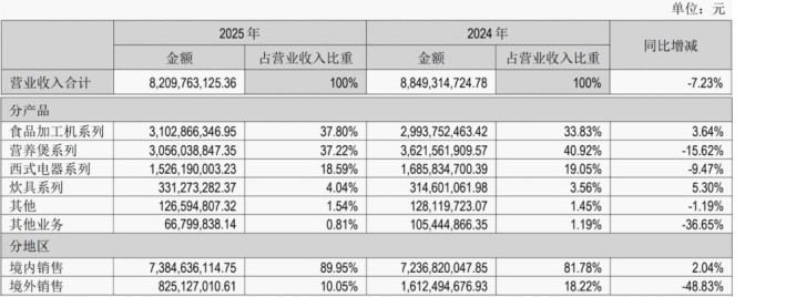 2025年九阳股份收入按分家具、地区画分的情况及同比变动