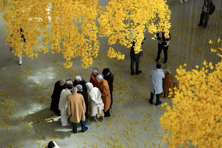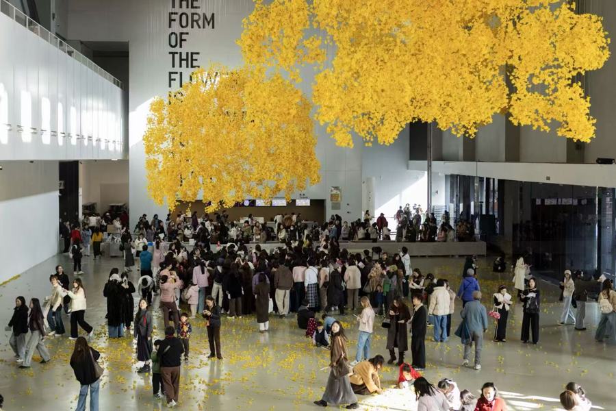 最近,一派黄色花海成为支吾平台新的“出片地”。上海现代艺术博物馆(PSA)一楼大厅,艺术家阿洛拉与卡萨迪利亚共同创作的安装《浮影暗昧》招引很多不雅众合影。这是第15届上海双年展的“顶流”展品之一,由17万朵手工制作的黄风铃木花构成。
