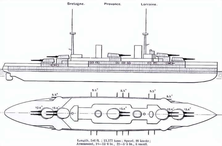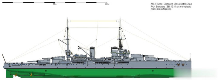 布列塔尼号1912年7月在布雷斯特开工,1913年4月下水,1916年2月当兵。