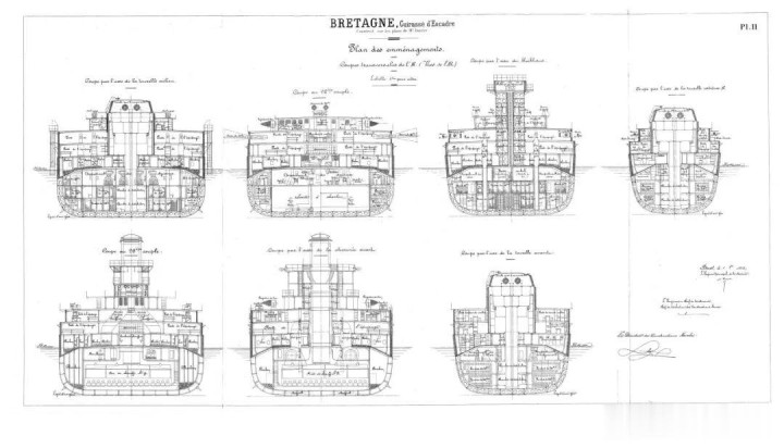 布列塔尼级战列舰全长166米,宽26.9米,想象排水量23936吨,满载排水量26000吨,艏艉吃水差异为8.9米和9.8米。主舰体想象与孤拔级极为相似:笔直舰艏仍加强可作撞角,无内倾的笔直舰体,尖削舰艉。