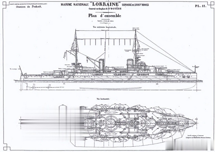 洛林号1912年11月在圣纳泽尔开工,1913年9月下水,1916年3月当兵。因一战爆发,原定1915年完工的议论推迟至1916年。